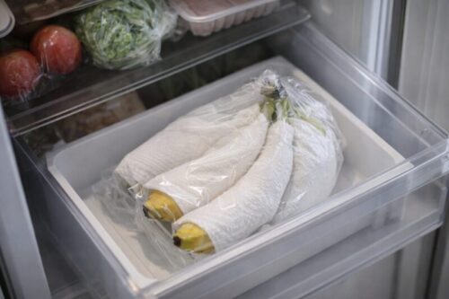 • バナナをキッチンペーパー→ポリ袋の順で軽く包み、野菜室へ入れると湿度と温度が安定して長持ちします。