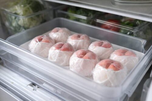 • 冷蔵保存:完熟した桃を短期間(1〜3日)だけ保つのに向いています。冷やしすぎると香りが弱まり、果肉が硬くなることがあるため、野菜室(7〜10℃程度)が理想的です。直接冷気に当たらないように紙やキッチンペーパーで包むとよいでしょう。