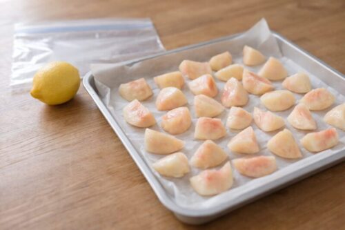 4. できれば金属トレイを使って凍らせると、熱伝導が良く短時間で冷凍でき、細胞の破壊を抑えられます。これにより、解凍後も果肉の繊維が保たれます。
