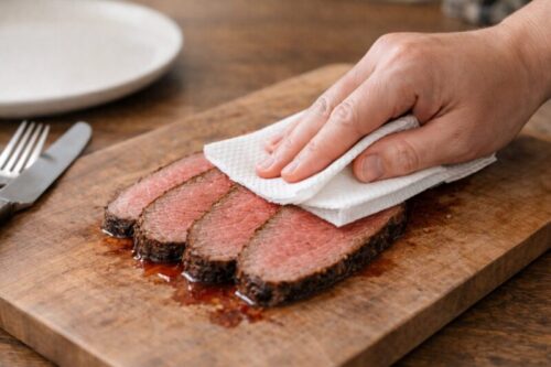 - カット後にキッチンペーパーで軽く押さえ、余分な肉汁を取る